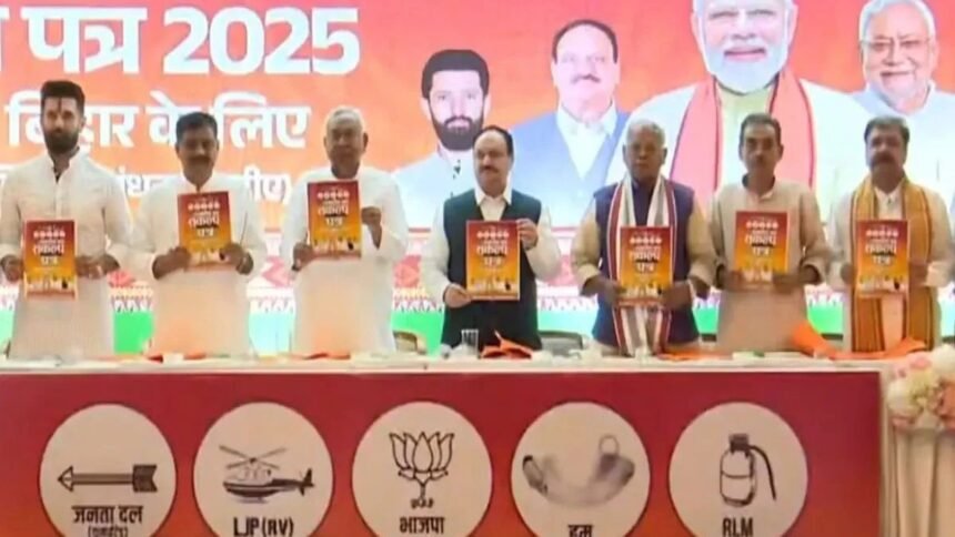 नई दिल्ली. पटना के होटल मौर्य में शुक्रवार को राष्ट्रीय जनतांत्रिक गठबंधन (NDA) ने बिहार विधानसभा चुनाव 2025 के लिए अपना संकल्प पत्र (Manifesto) जारी किया। कार्यक्रम में NDA के सभी घटक दलों – भाजपा (BJP), जेडीयू (JD-U), लोजपा (रामविलास), हम (HAM) और आरएलएम (RLM) – के वरिष्ठ नेता मौजूद रहे।