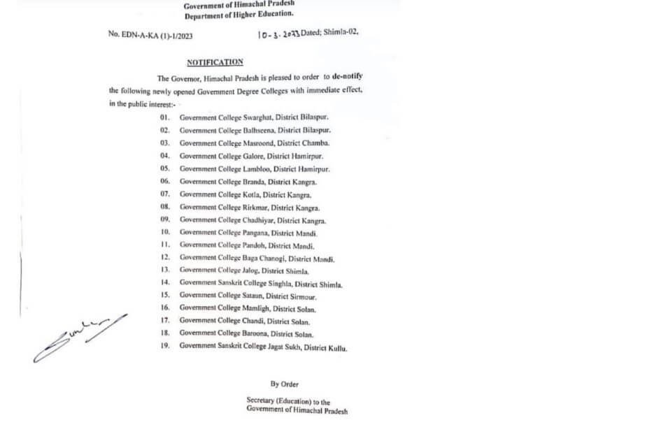 सरकार ने जीरो या कम स्टूडेंट वाले कॉलेजों पर ताला जड़ दिया है. इनका स्टाफ दूसरे कालेजों के लिए शिफ्ट कर दिया गया है. इसी तरह अपग्रेडेड स्कूलों से भी स्टाफ हटाकर दूसरी जगह एडजस्ट किया गया. डिनोटिफाई किए गए स्कूल व कालेज पूर्व जयराम सरकार ने चुनाव से कुछ महीने पहले खोले या अपग्रेड किए थे. बंद किए गए कालेज में एक संस्कृत कालेज भी शामिल है.